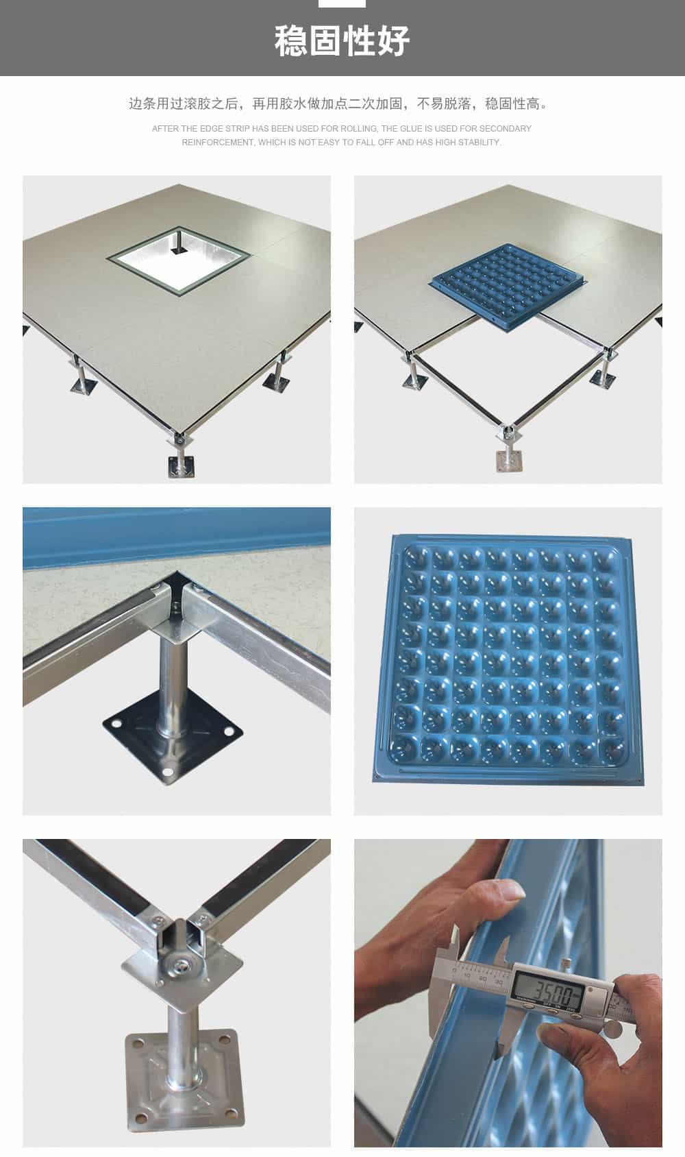 全鋼防靜電地板為全鋼組件,分有邊、無邊、微邊(三種邊處理方式)。底面采用SPCC深沖冷軋板拉伸成型鋼板厚度(0.4~1.5mm),球窩狀結(jié)構(gòu),增加地板的機械荷載強度。面板采用硬質(zhì)SPCC鋼板(0.5~2.0mm),上下經(jīng)過點焊焊接成型,切邊沖孔后,經(jīng)防銹處理,環(huán)氧樹脂粉末靜電噴涂后,中間填充發(fā)泡水泥(可以根據(jù)客戶需求發(fā)泡不同重量),再經(jīng)過日曬養(yǎng)護后形成穩(wěn)定的承載結(jié)構(gòu)。地板上表層粘貼防火板(HPL)/復(fù)合PVC/ 通體PVC/陶瓷地磚等不同材質(zhì)的裝飾表層,達到產(chǎn)品花色的多樣性、可以根據(jù)客戶需求個性化定制產(chǎn)品。搭配聯(lián)網(wǎng)支架、支架、螺釘組裝后,定位聯(lián)接更加準確、精度可靠。
