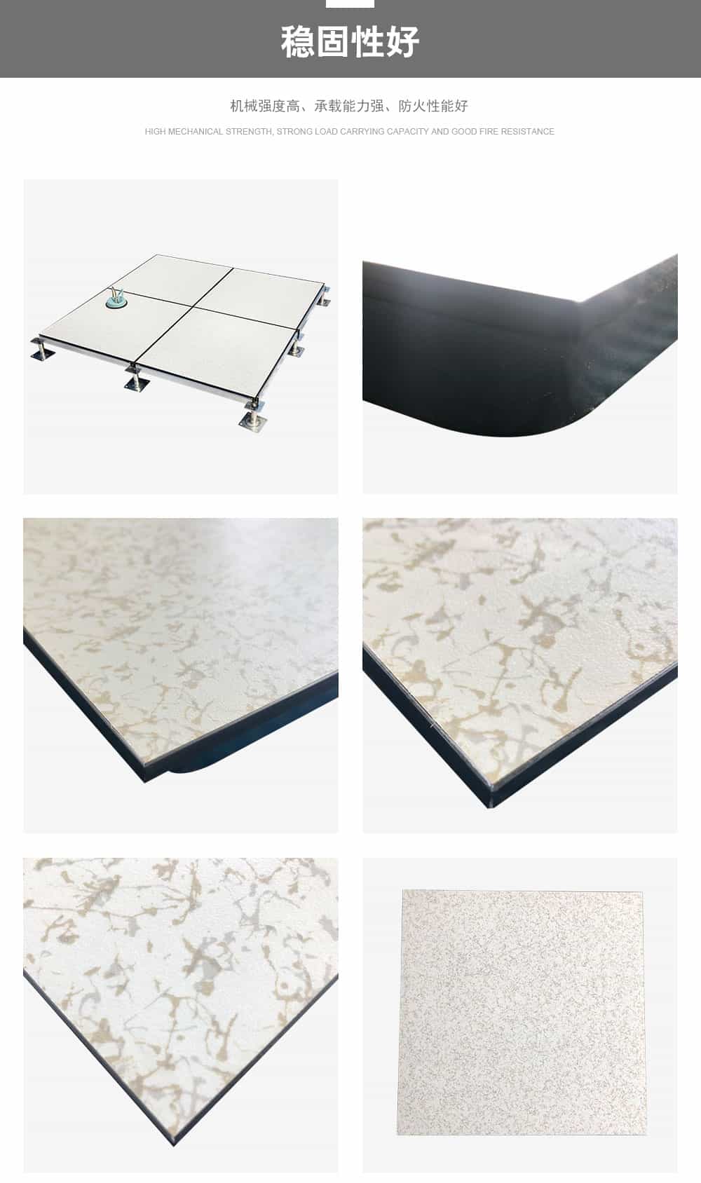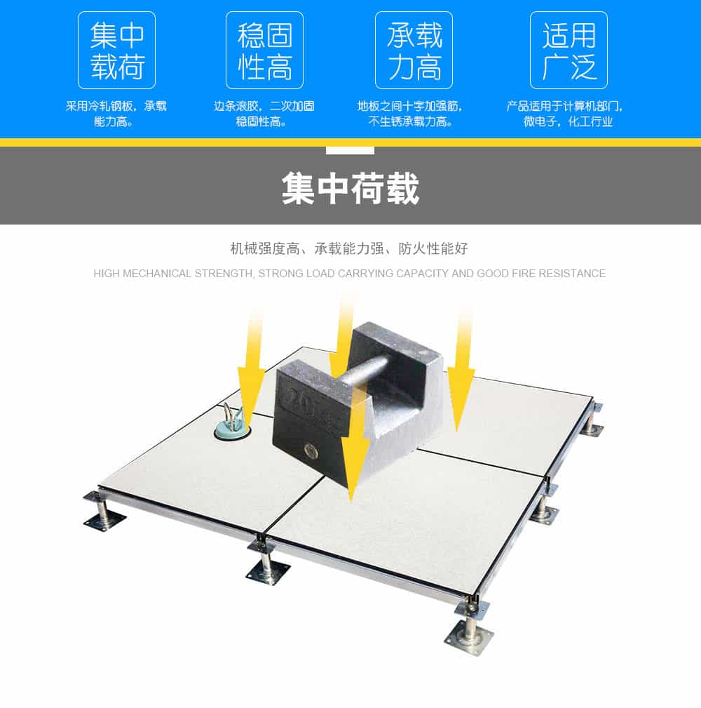 全鋼防靜電地板為全鋼組件,分有邊、無邊、微邊(三種邊處理方式)。底面采用SPCC深沖冷軋板拉伸成型鋼板厚度(0.4~1.5mm),球窩狀結(jié)構(gòu),增加地板的機械荷載強度。面板采用硬質(zhì)SPCC鋼板(0.5~2.0mm),上下經(jīng)過點焊焊接成型,切邊沖孔后,經(jīng)防銹處理,環(huán)氧樹脂粉末靜電噴涂后,中間填充發(fā)泡水泥(可以根據(jù)客戶需求發(fā)泡不同重量),再經(jīng)過日曬養(yǎng)護后形成穩(wěn)定的承載結(jié)構(gòu)。地板上表層粘貼防火板(HPL)/復(fù)合PVC/ 通體PVC/陶瓷地磚等不同材質(zhì)的裝飾表層,達到產(chǎn)品花色的多樣性、可以根據(jù)客戶需求個性化定制產(chǎn)品。搭配聯(lián)網(wǎng)支架、支架、螺釘組裝后,定位聯(lián)接更加準確、精度可靠。