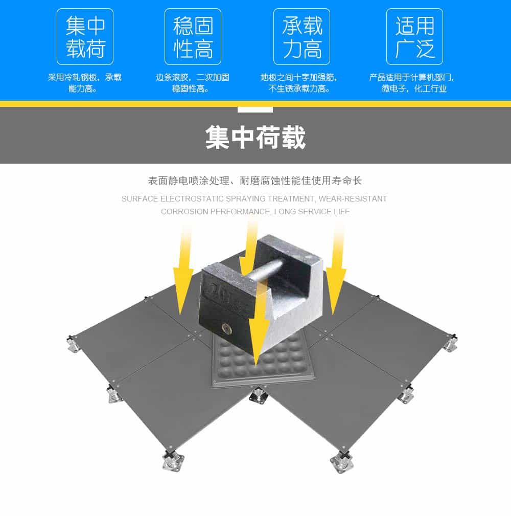 OA500網(wǎng)絡(luò)架空地板采用鋼板經(jīng)拉伸成型、點(diǎn)焊、外表經(jīng)防銹處理后進(jìn)行靜電粉末噴涂處理,內(nèi)腔填充發(fā)泡水泥,四角帶有角鎖孔。支架為冷軋帶鋼鋼板及鑄鋁合金鋁頭組成,可調(diào)節(jié)升降高度。由于智能化樓宇配線復(fù)雜,功能齊全,故出線口較多。