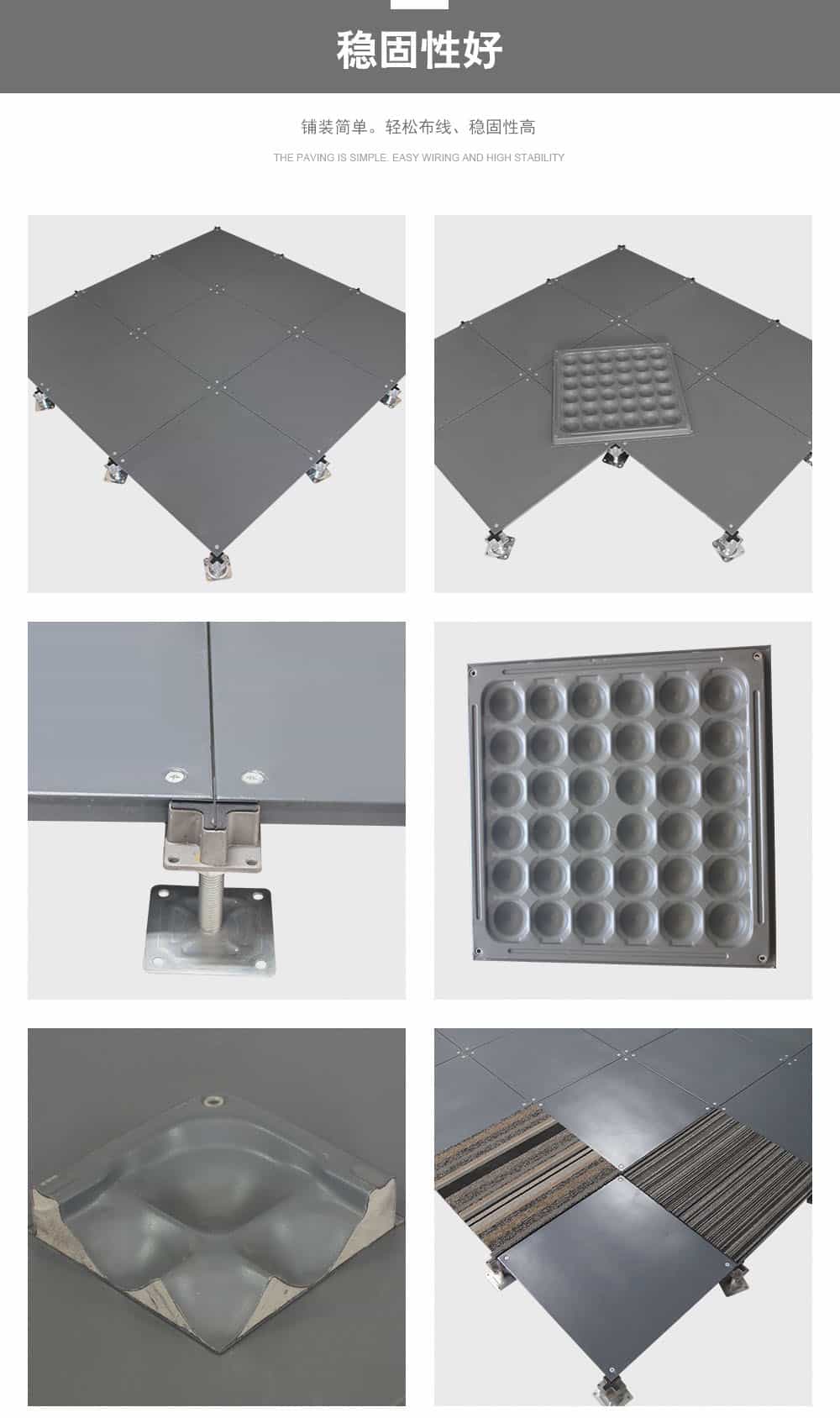 該地板可以選配帶出線口的配置,可根據(jù)要求任意添加線槽布線更具靈活性。此地板可以將強(qiáng)、弱電分開隔離,同時(shí)也便于檢修。安裝采用無(wú)梁角鎖,具有牢靠、穩(wěn)定、調(diào)平、簡(jiǎn)便之特點(diǎn)。