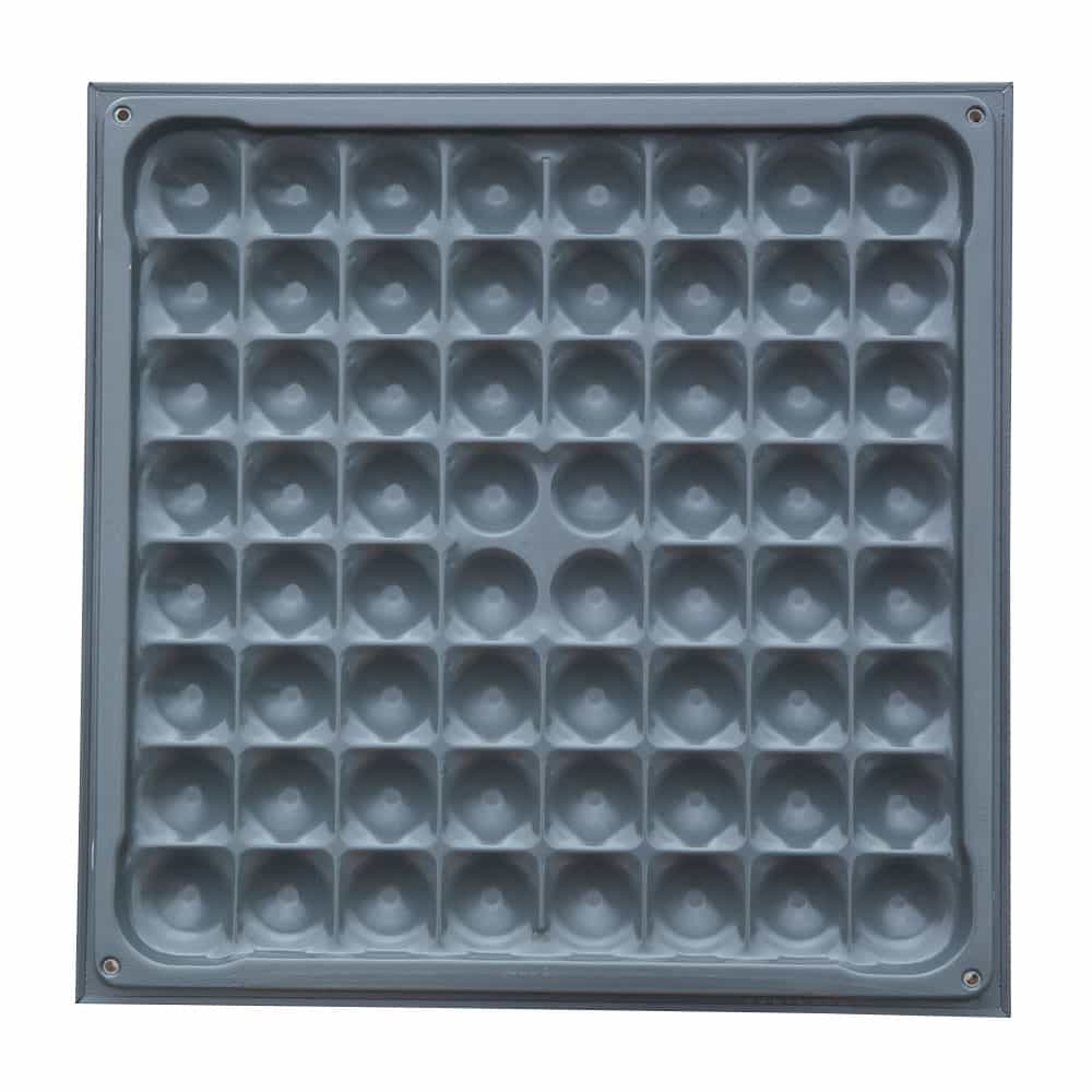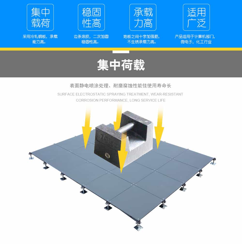OA600網(wǎng)絡架空地板采用鋼板經(jīng)拉伸成型、點焊、外表經(jīng)防銹處理后進行靜電粉末噴涂處理,內(nèi)腔填充發(fā)泡水泥,四角帶有角鎖孔。支架為冷軋帶鋼鋼板及鑄鋁合金鋁頭組成,可調(diào)節(jié)升降高度。由于智能化樓宇配線復雜,功能齊全,故出線口較多。