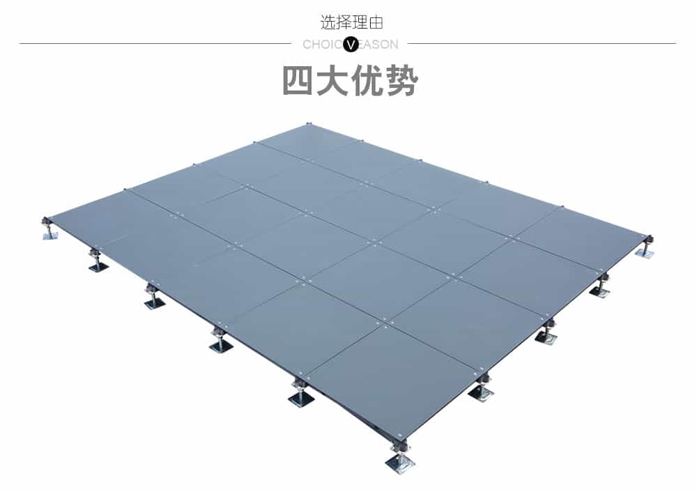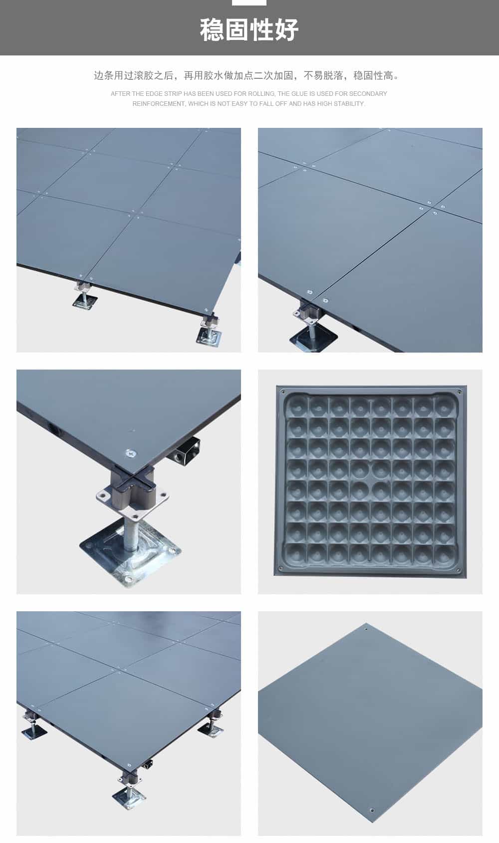 該地板可以選配帶出線口的配置,可根據(jù)要求任意添加線槽布線更具靈活性。此地板可以將強、弱電分開隔離,同時也便于檢修。安裝采用無梁角鎖,具有牢靠、穩(wěn)定、調(diào)平、簡便之特點。